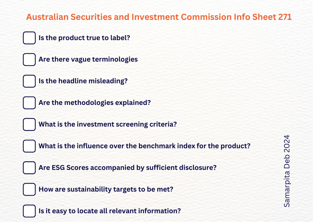 In Australia, greenwashing is managed in a multi-pronged manner using provisions in the Australian Corporations Act, Australian Consumer Law, Australian Securities and Investment Commission (ASIC) Act, ASIC’s Info Sheet 271 applicable for public companies, managed funds, and superannuation funds (offering financial products), ISSB framework for sustainability and climate related disclosure, Australian Competition and Consumer Commission Guidelines, and Australian Association of National Advertisers (AANA) Environmental Claims Code.