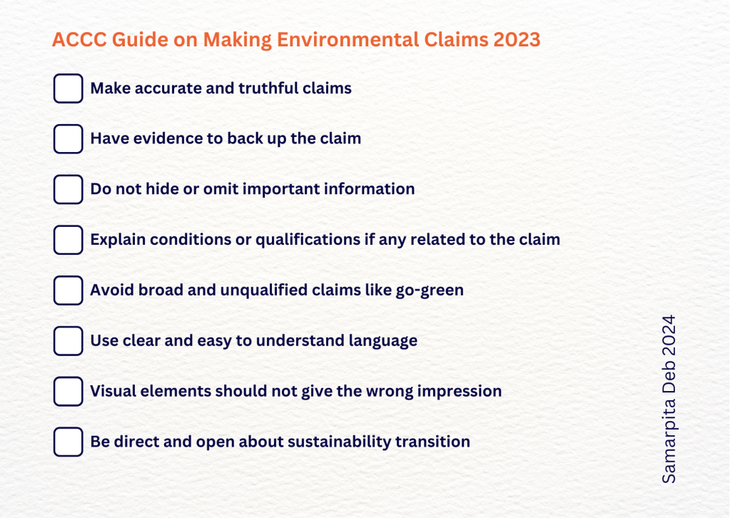 - Avoid broad and unqualified claims like “green”, “go green”, “eco-friendly” etc. ACCC recommends that claims like these are qualified to avoid misleading consumers. Claims like “climate neutral”, or “net-zero” will fall in this category. The expectation is, when such claims are made, sufficient assessment is made using recognised methodologies, providing clear information about what is included and what is excluded, account for all types of green-house emissions and not just focus on carbon dioxide to avoid misleading, among others. Highly polluting industries are cautioned additionally by ACCC in making such claims.