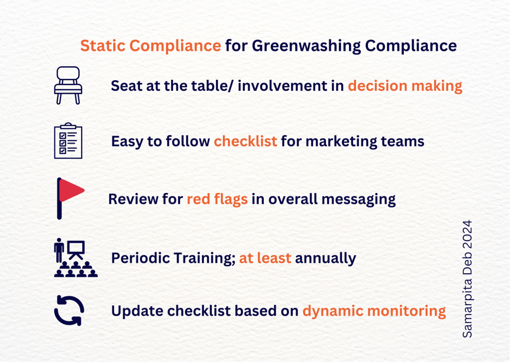 The first part of the compliance is the static compliance. This is the part where we work with our marketing and communications teams and ensure that the team can avoid the most egregious claims of greenwashing and complies with existing regulatory guidelines. But please note that this is not a fully static set-it-up-and-forget kind of compliance. This will also need periodical updating.