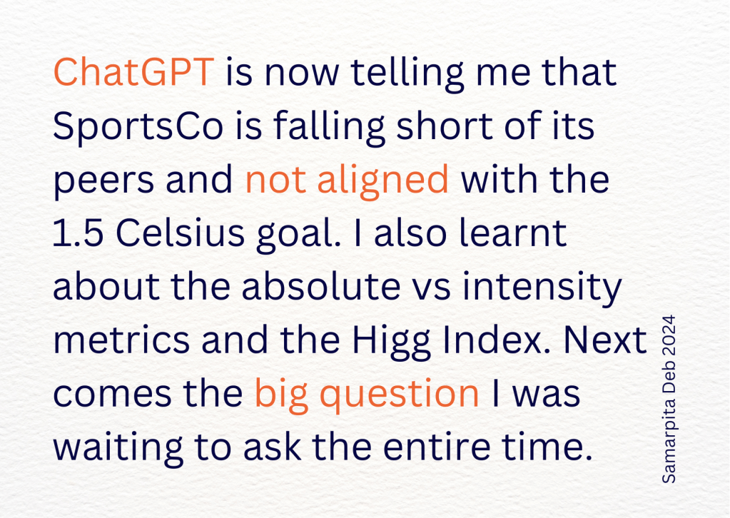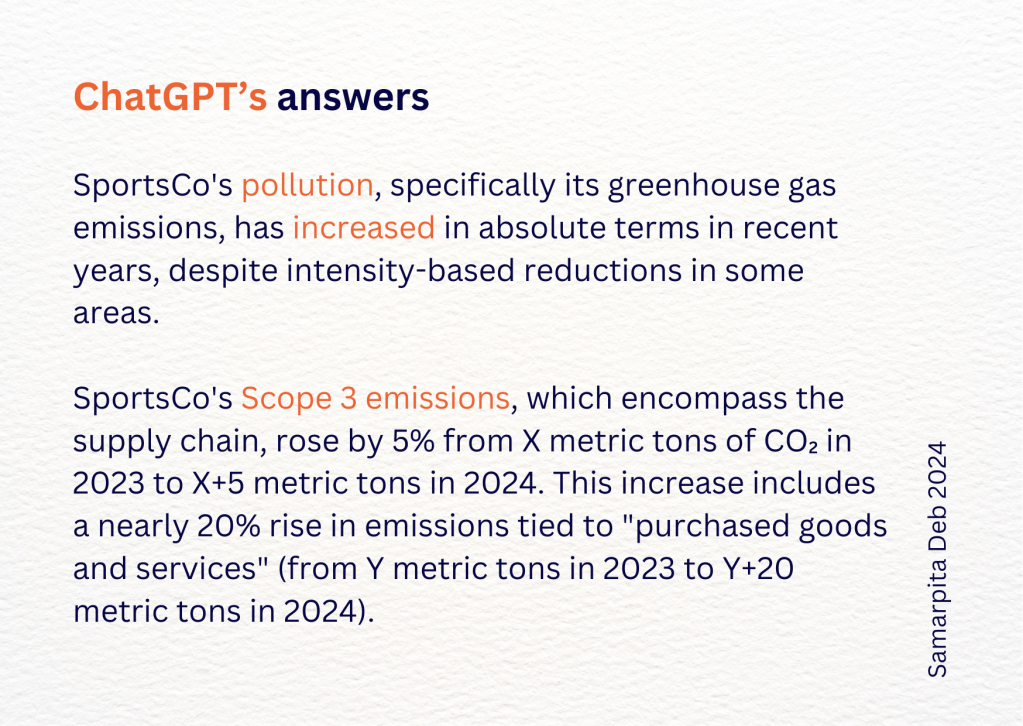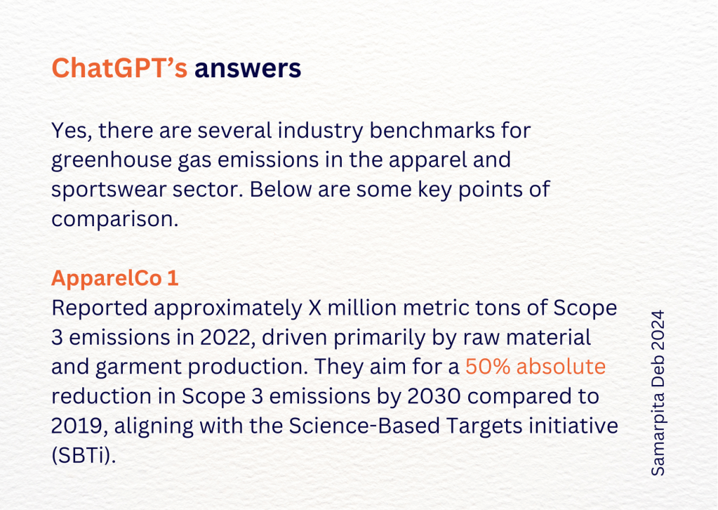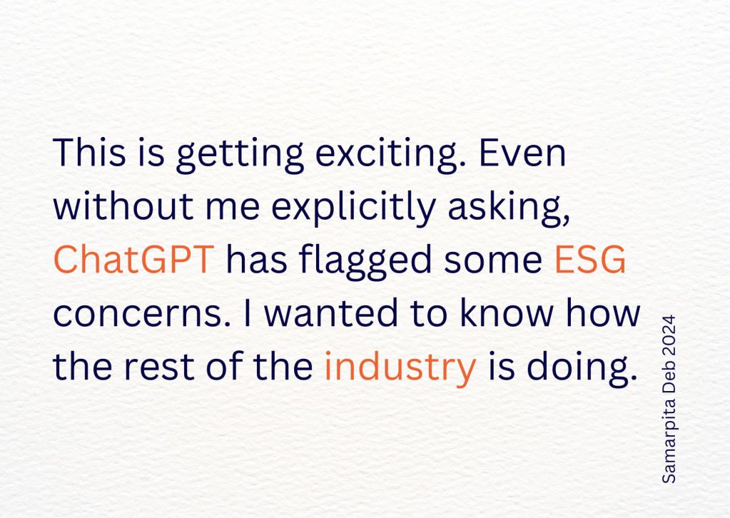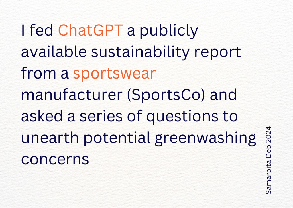 To write this article, I ran some experiments with ChatGPT and the results were fantastic, beyond what I expected. I decided to use ChatGPT as an assistant to help me find out potential greenwashing risks that I can flag to the imaginary management.