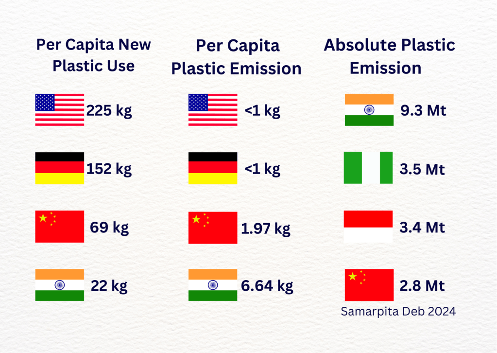 According to OECD’s Global Plastics Outlook published in 2022, usage of new plastic per person is 225 kg in the United States, 152 kg in European OECD countries, 69 kg in China, and a measly 22 kg in India